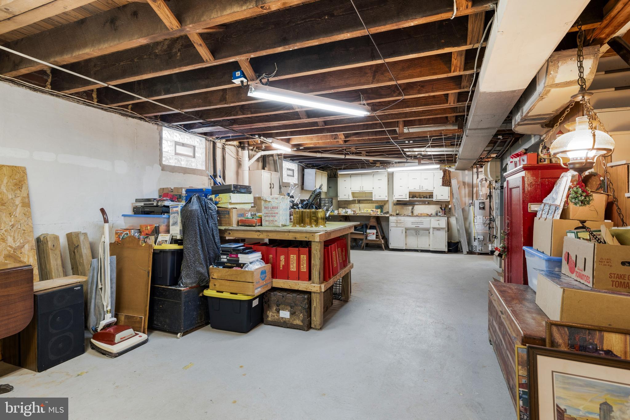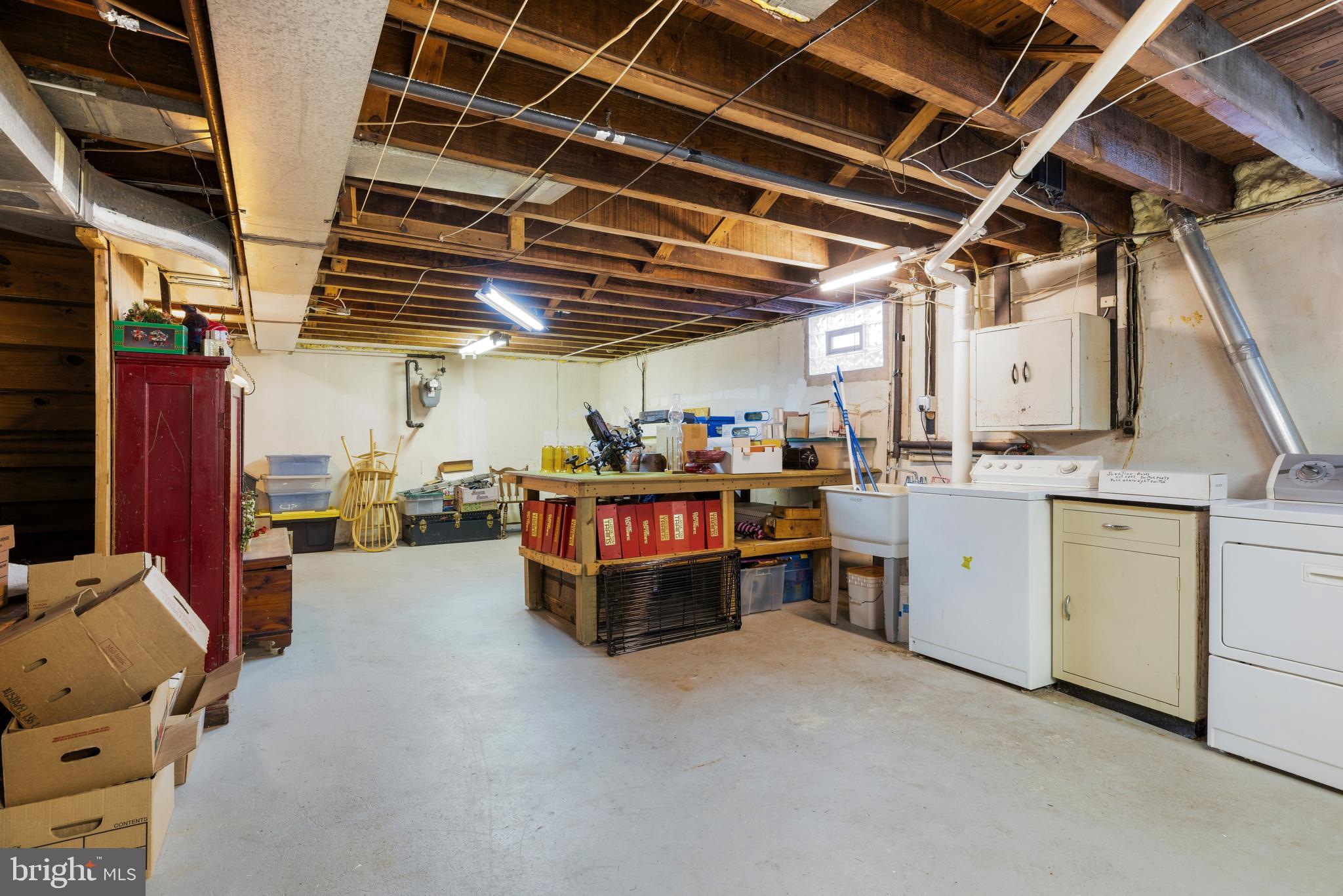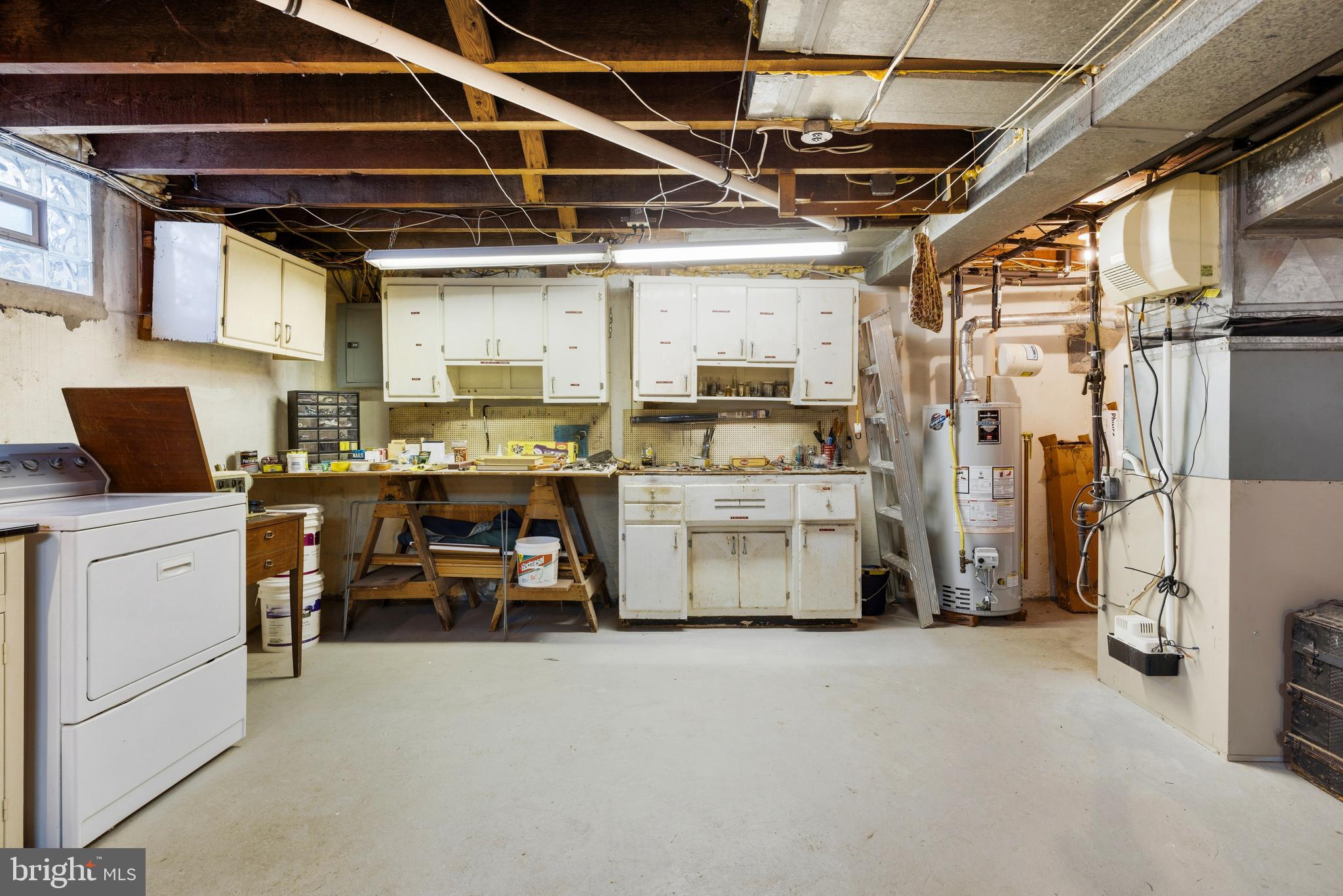 The large, dry basement provides exceptional storage and utility space with workbenches, shelving, storage cabinets, and a washer and dryer included.