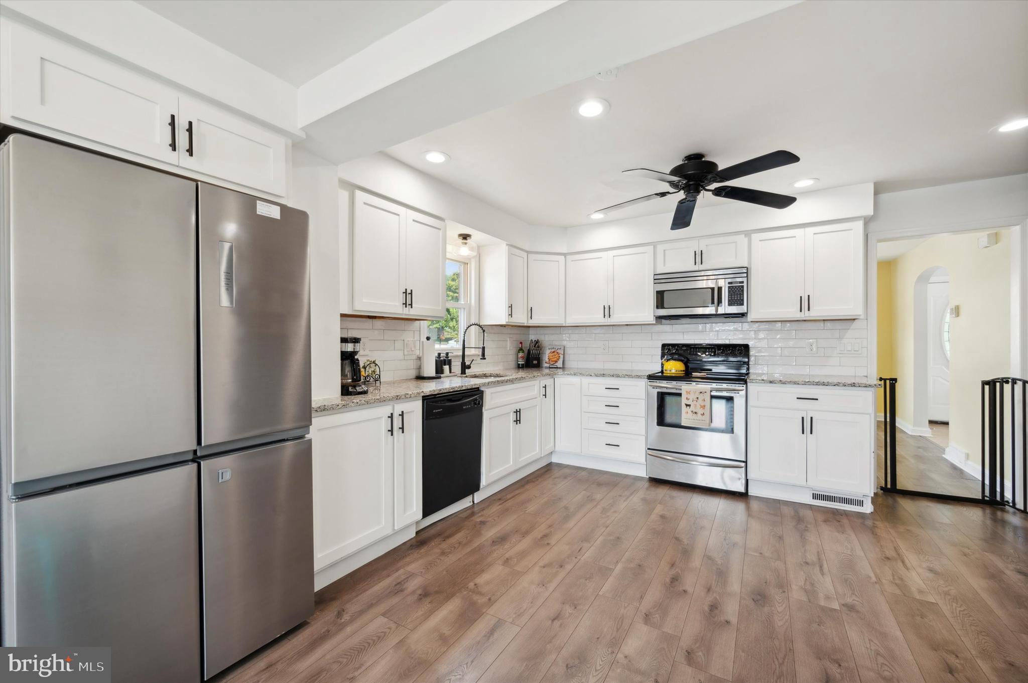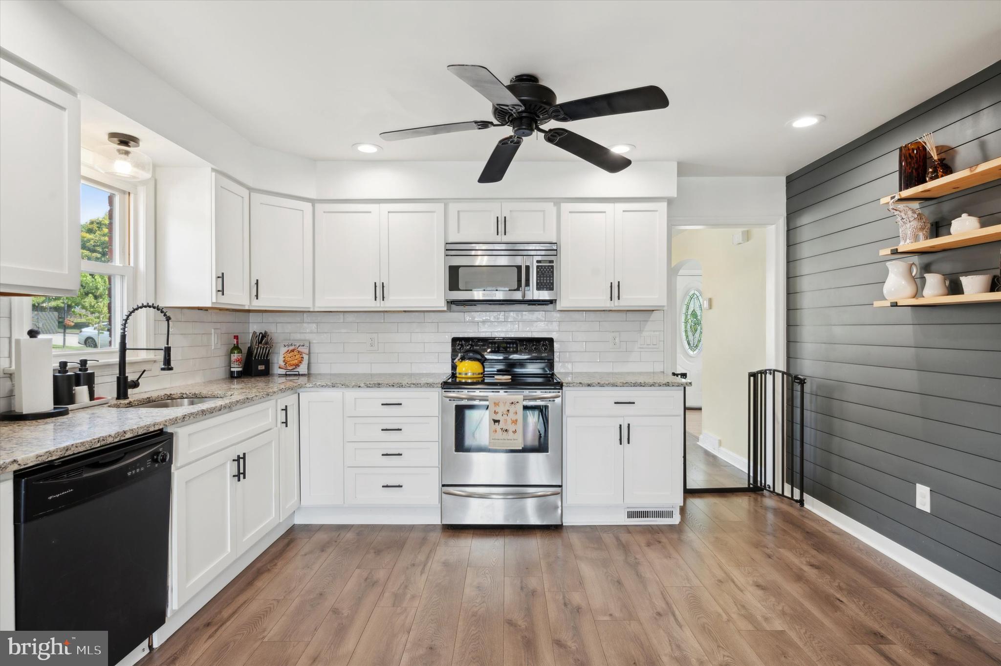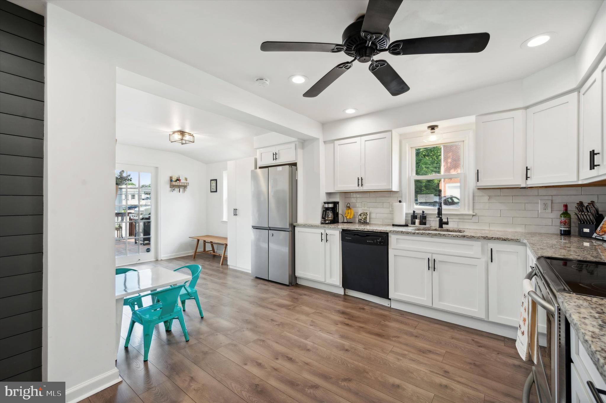 Step through the front door into a spacious living room, where a wood-burning fireplace awaits to warm your evenings, complemented by the timeless elegance of hardwood floors. The dining area, illuminated by a large bay window, creates an ideal backdrop for gatherings, while the adjacent modern kitchen will delight any culinary enthusiast. Featuring sleek stainless steel appliances, chic white cabinetry, and a unique wood architectural accent wall, this kitchen is not only functional but also a conversation starter. The luxury vinyl flooring and recessed lighting add just the right touch of sophistication.