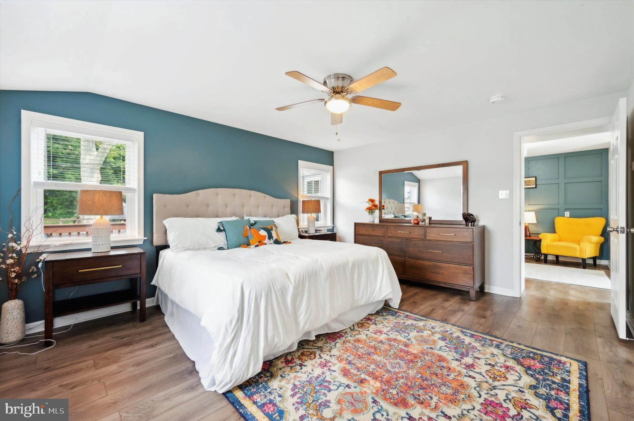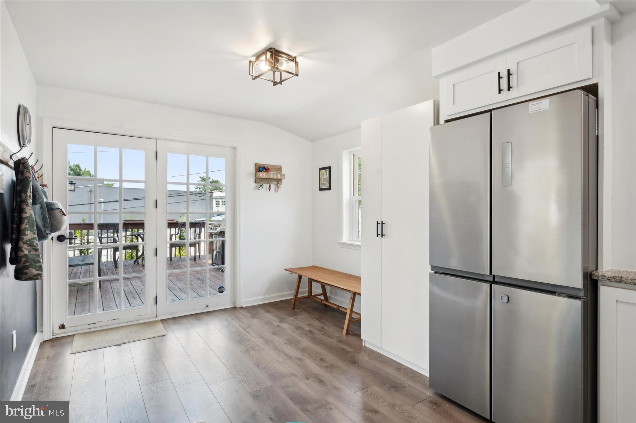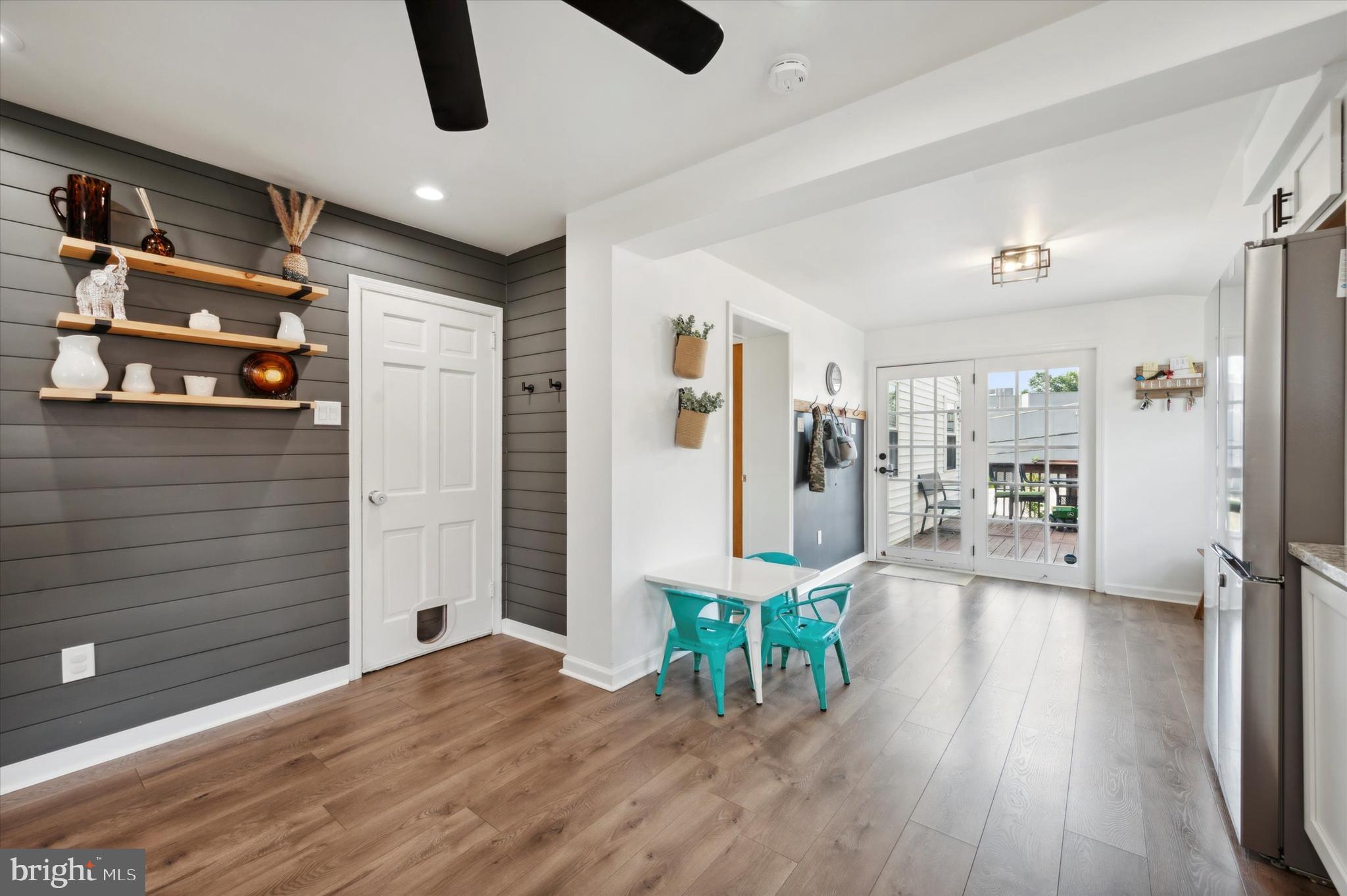 Step through the front door into a spacious living room, where a wood-burning fireplace awaits to warm your evenings, complemented by the timeless elegance of hardwood floors. The dining area, illuminated by a large bay window, creates an ideal backdrop for gatherings, while the adjacent modern kitchen will delight any culinary enthusiast. Featuring sleek stainless steel appliances, chic white cabinetry, and a unique wood architectural accent wall, this kitchen is not only functional but also a conversation starter. The luxury vinyl flooring and recessed lighting add just the right touch of sophistication.