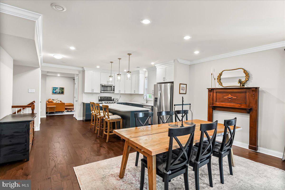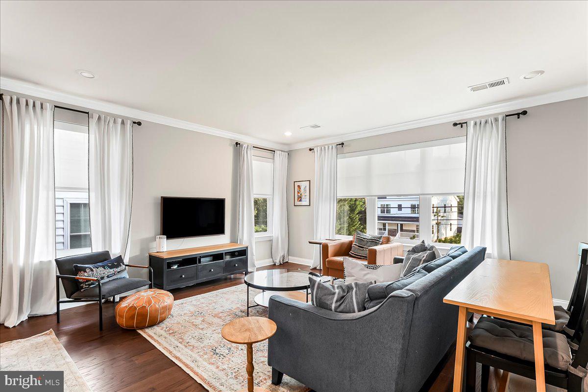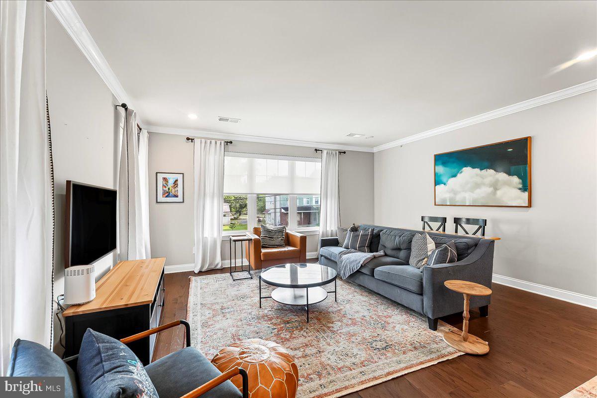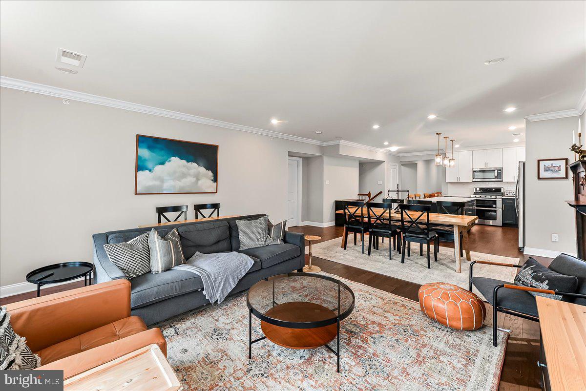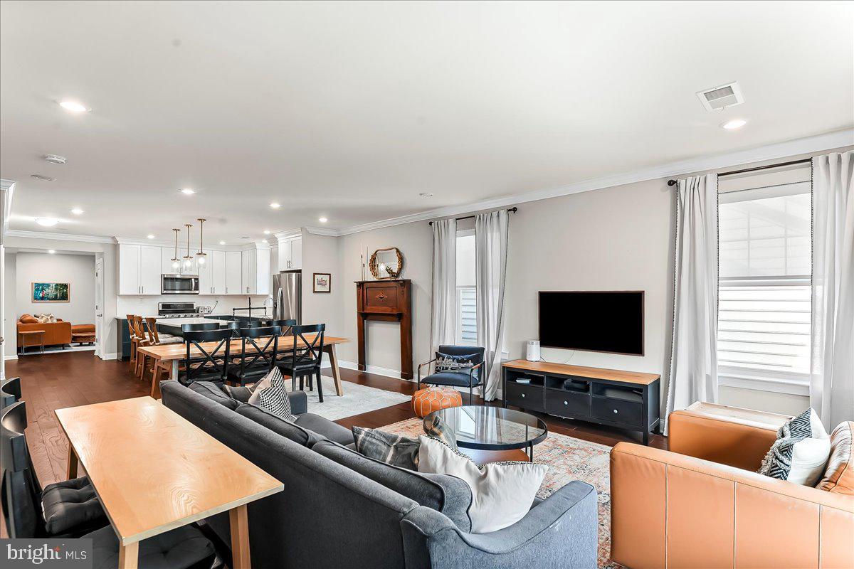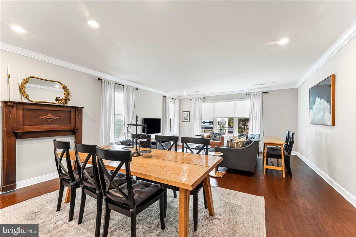 The living room features large picture windows, crown molding, and ample seating space--all anchored by a cozy, modern aesthetic. A charming dining area, which easily accommodates large gatherings.